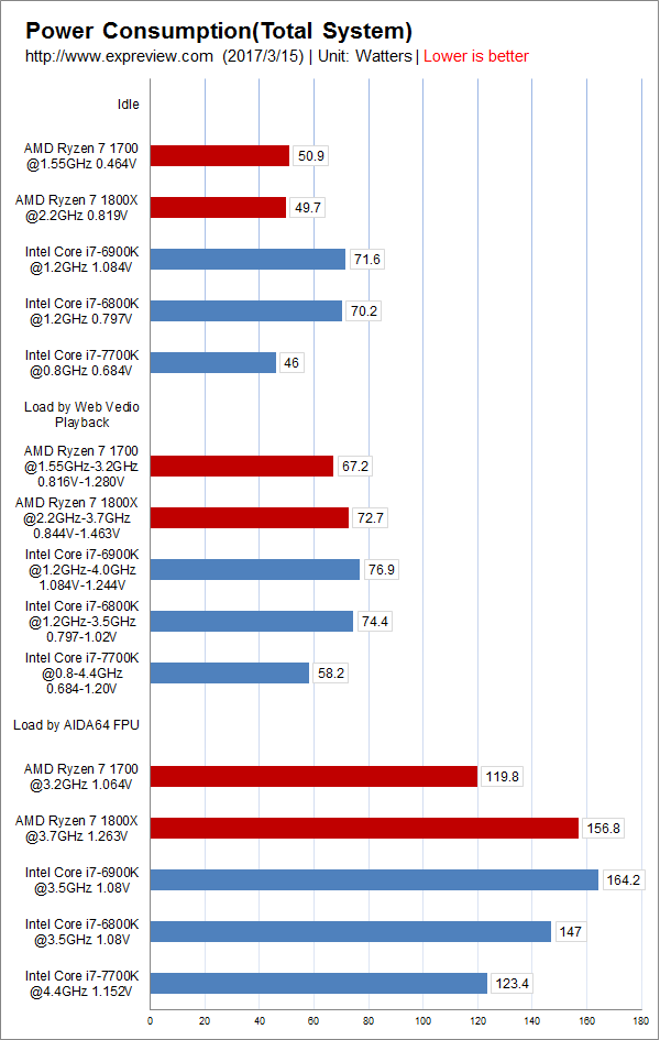 功耗测试这里我们加入了之前所测试的ryzen 7 1800x与core i7-6900k的数据进去,虽然这次所用的散热器不相同,不过散热器对整机功耗的影响相当的小。