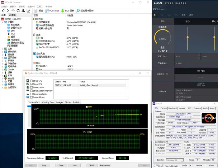 目前要看到锐龙 amd ryzen的准确温度依然要用amd的官方超频软件amd ryzen master utility,而且前段时间amd放出过公告说锐龙 amd ryzen处理器的主要温度传感器tctl在ryzen 7 1800x与ryzen 7 1700x上设置了+20℃的偏移,这样做的目的是为了确保所有ryzen处理器都有一致的风扇策略,这也是我们之前测试ryzen 7 1800x时温度偏高的原因,而这次测试的ryzen 7 1700就没有这个问题。