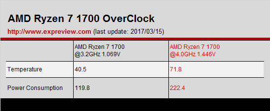 超频后的ryzen 7 1700的功耗上升相当厉害,满载功耗从原来的119.8w升到222.4w,cpu功耗肯定直接翻倍了,温度也从要换了的40.5℃升到71.8℃,这功耗的升幅真的十分让人意外,真的要买ryzen 7 1700回去超频用的话一定得配上好的主板和电源才行,那些买回去配那些供电较差的b350主板的就别想超4ghz了。