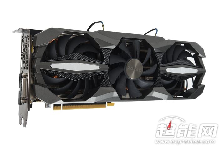 看到这款索泰gtx 1060-6gd5至尊plus oc,你可能会有一种似曾相识的感觉。没错,这和我们之前测试过的索泰gtx 1070-6gd5至尊plus oc是同宗同源,一脉相承。外观上是完全一致的,虽然是塑料的导风外壳,但是银灰色搭配小量碳纤维纹理,配合上三风扇设计,营造出一种硬朗而霸气的外观感觉。显卡全长300mm而且没有采用越肩式设计,使得整体十分修长。