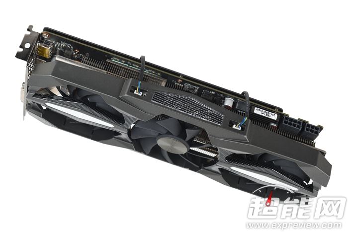 其实镂空处配合上两侧小凹槽可以安装两个小风扇(随显卡标配一个,另一个为选配),可以针对gpu和mos管位置的pcb进行有效散热,这就是索泰首创的“3d-storm立体散热引擎”。两个小风扇供电位置在zotac logo两旁,但是突兀的风扇电源线显得有些违和,设计上应该可以更进一步,如果能做到xfx的可拆卸触点式设计就更好了,既美观又便捷。