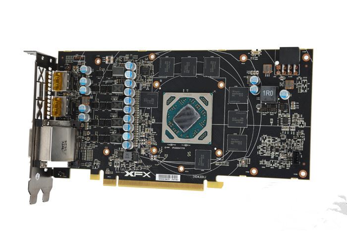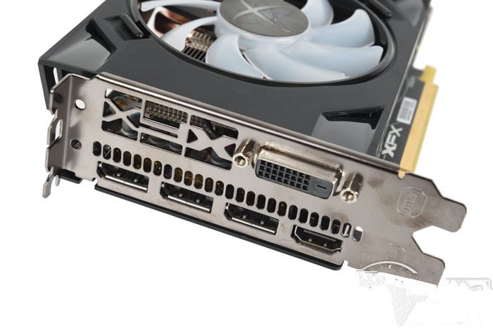 视频输出接口包括三个dp接口、一个hdmi接口和一个dvi-d接口,挡板依旧那么有xfx风格