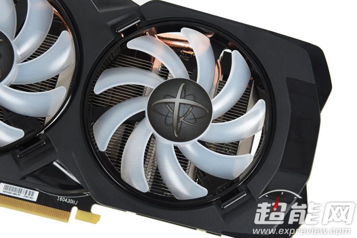 讯景rx 470 深红纪念版的外形是明显与rx 470黑狼·进化差不多,只不过风扇变了,从原来的无光风扇变成了发光风扇,扇叶是白色半透明的,两把9cm风扇是可拆卸的,可以很方便的拆下来除尘清洗,显卡长度为24cm。