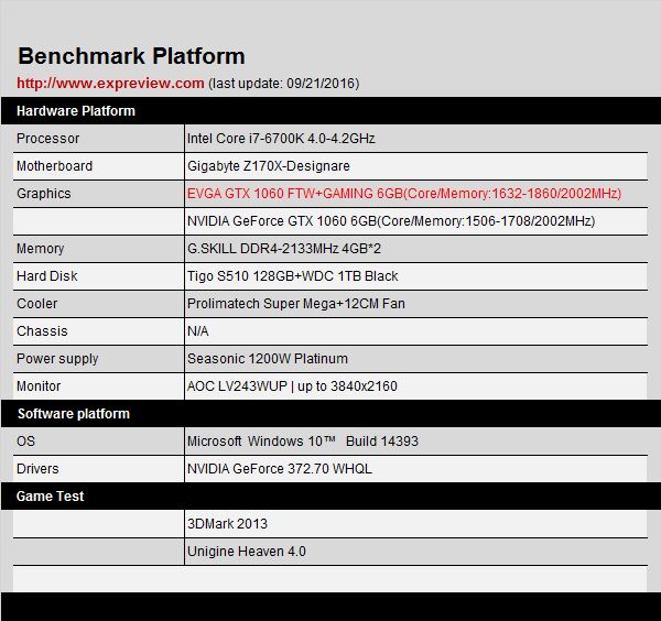 测试平台采用的配置为skylak平台基础搭建的gigabyte z170x-designare主板,处理器为intel core i7-6700k ,内存是g.skill ddr4-2133mhz 4gb*2组成的双通道,电源为seasonic 1200w platinum,操作系统为microsoft windows 10™ build 14393,驱动程序是nvidia geforce 372.70 whql。