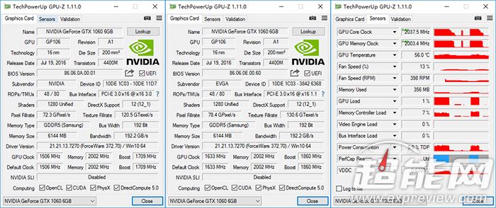 gtx 1060公版参数(最左),gtx 1060 ftw+gaming参数(中间)