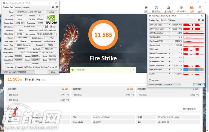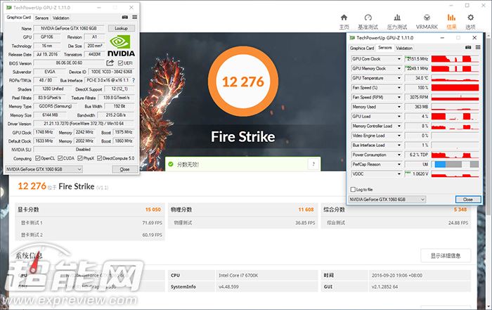 gtx 1060 ftw+gaming基础频率1633mhz,标注boost频率1860mhz,显存频率8gbps,相对公版gtx 1060频率可以说是一个质的飞跃,而在运行3dmark的时候,实际boost最高频率可以达到2037mhz的高度。