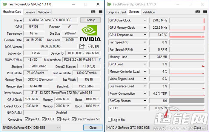 gtx 1060 ftw+gaming是支持风扇智能停转技术的,在待机和进行轻负载工作的时候,风扇是停止工作的,此时的封箱温度只有33度,vddc电压和频率也较低,当负载上升到一定的程度,显卡温度达到60摄氏度以上,风扇才会开始工作的,这种技术可以延长风扇的寿命,同时免去了风扇运转时候产生的噪声。