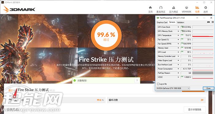 经历过20道场景考验后,gtx 1060 ftw+gaming顺利通过fire strike压力测试,boost频率最高能达到2012mhz,同时最高温度稳定在73摄氏度,风扇转速最高才1043prm,运行的时候风扇相当安静,小编坐在旁边几乎听不到显卡有任何动静。