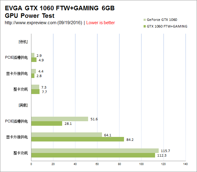 从待机功耗方面看,gtx 1060 ftw+gaming的整卡功耗还不到10w,甚至是radeon rx 480待机功耗的一半不到的瓦特数,而相比上一代maxwell显卡也要低不少,而在高负载的3dmark fire strike压力测试中,gtx 1060 ftw+gaming整卡功耗才112w,比公版gtx 1060还要低一点点,公版gtx 1060在pcie插槽中取电相对比较多,这是因为两者pcb用料的差异性以及转换率等因素造成的,总得来说,因为在架构制程以及用料等方面带来实质性的收益,所以gtx 1060 ftw+ gaming的功耗控制非常优秀。