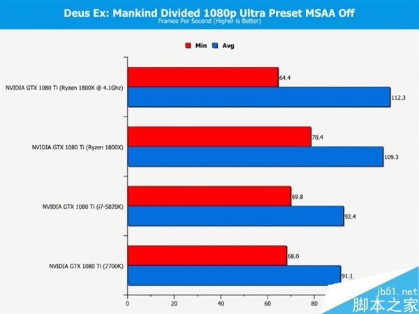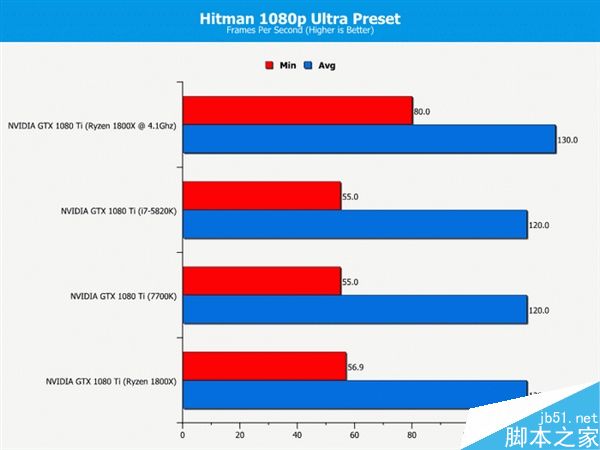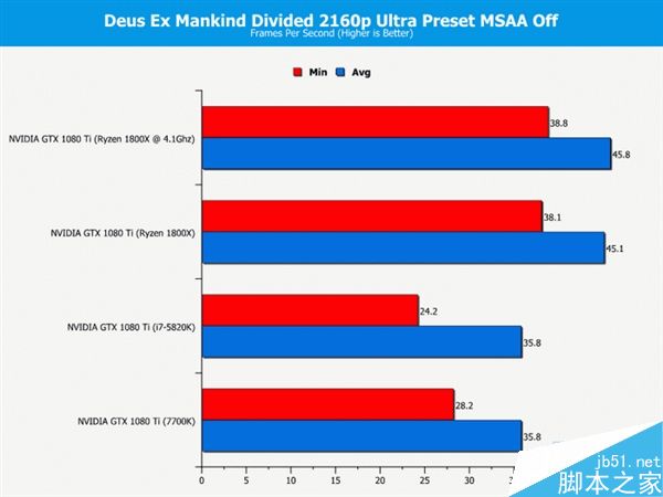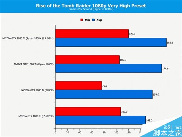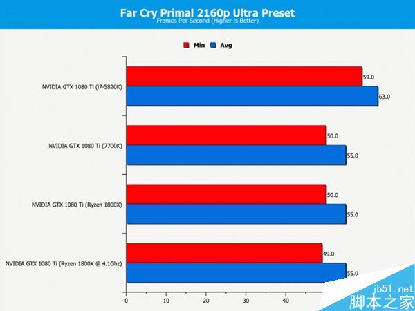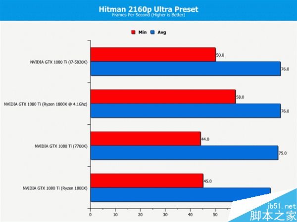这个游戏中ryzen处理器也是有一定优势的(1080p下帧率都达到限制了),当然主要是针对1800x vs 7700k而言,与5820k的差距就不大,4k下甚至还被反超。