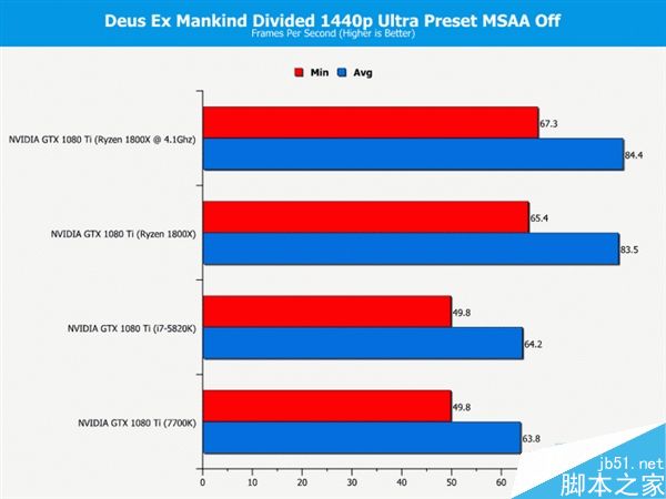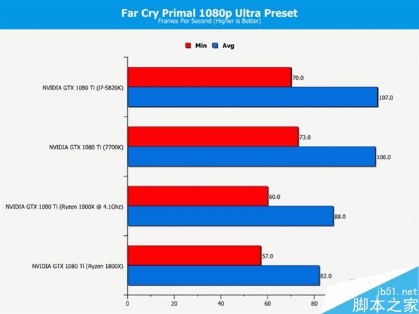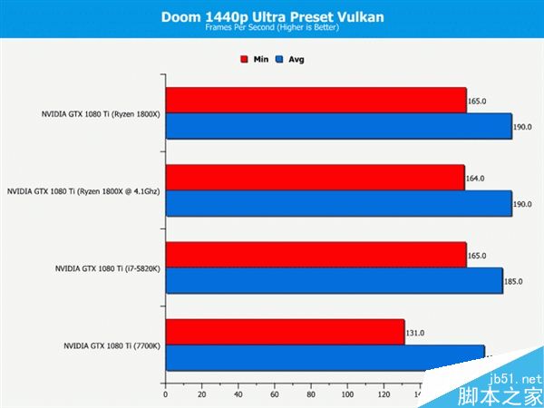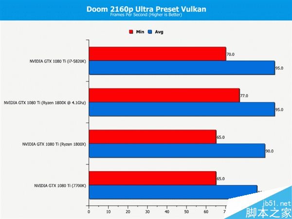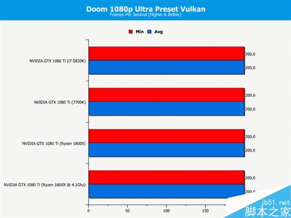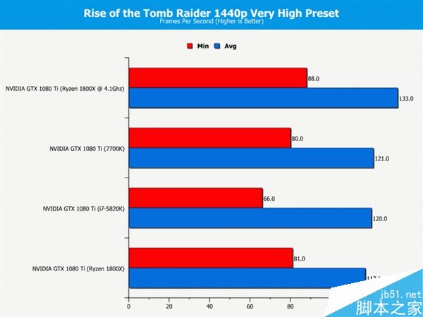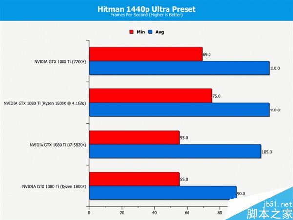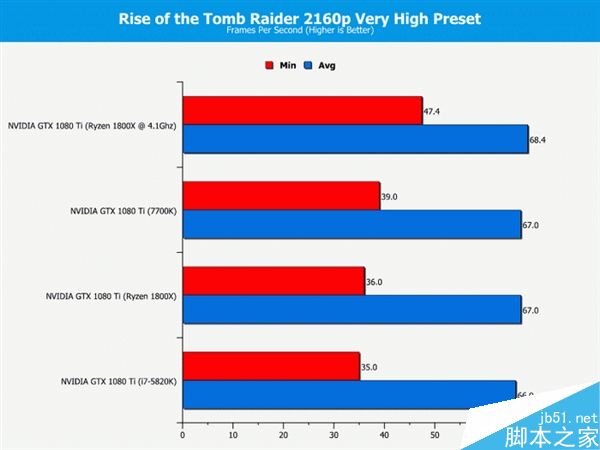 ryzen处理器在1080p分辨率依然有一定优势,不过1440及4k分辨率之下差距又会缩小,7700k在最低帧上还有可能反超。