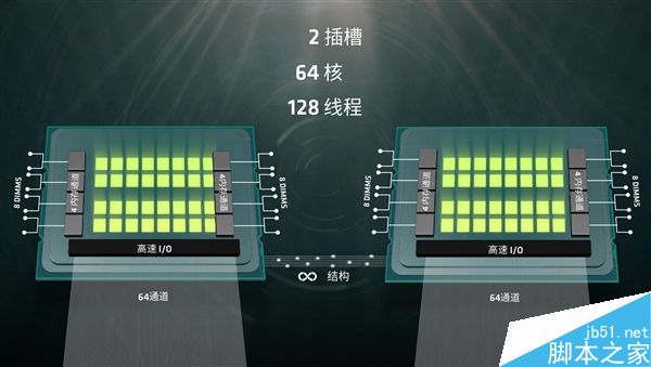 双路并行时,其中一半用于两个cpu之间互通,并利用infinity fabric结构确保互连一致性,对外再各自提供64个通道。