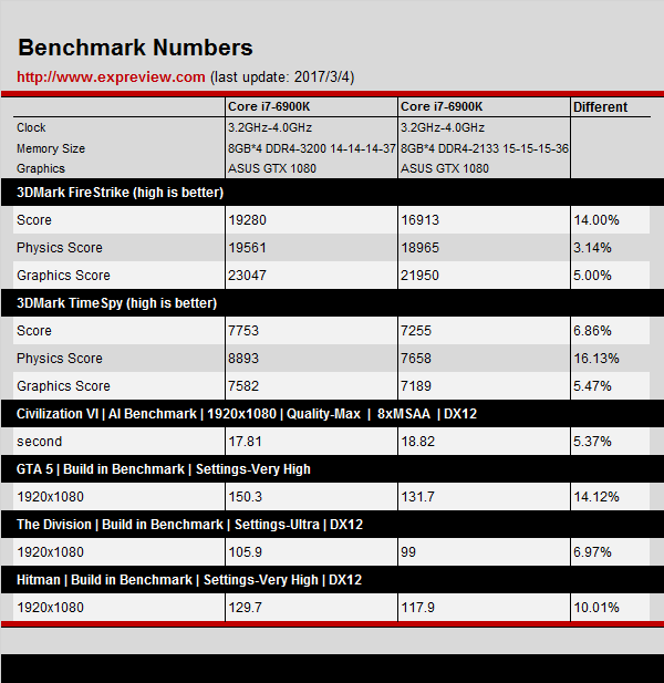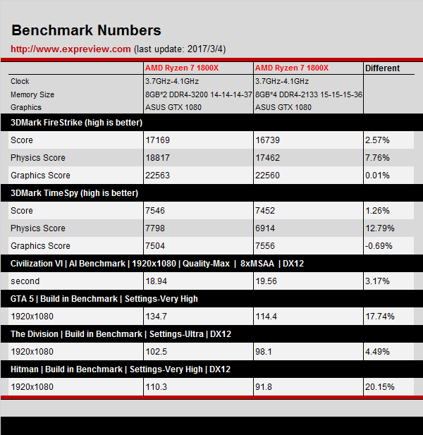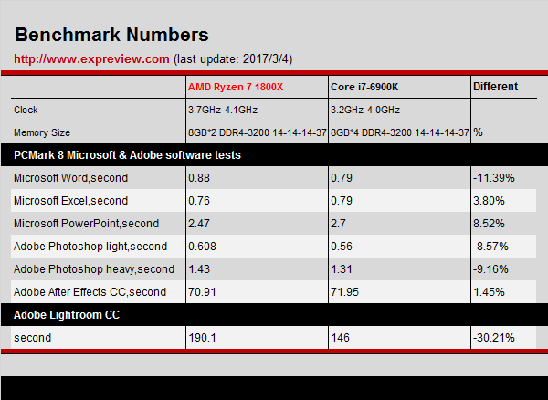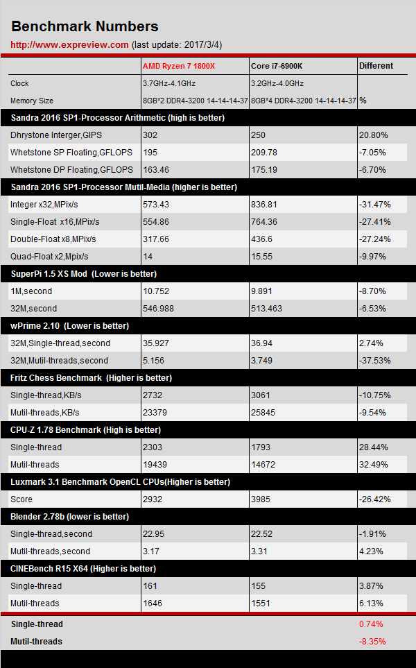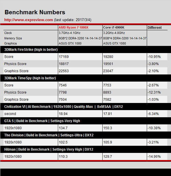 搭配ddr4-3200的锐龙 ryzen 7 1800x与intel core i7-6900k性能对比: