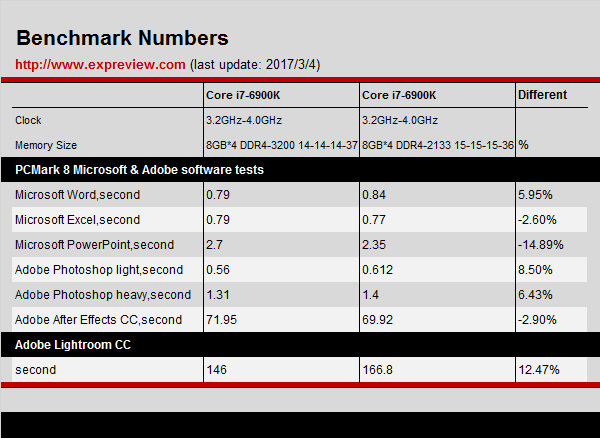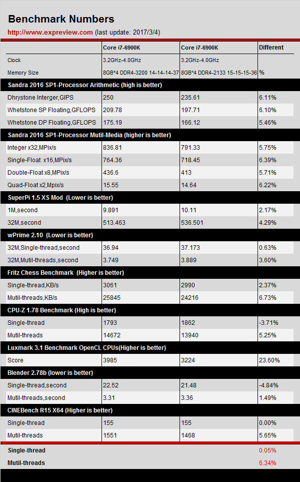 本以为原来就有四通道的core i7-6900k并不存在内存带宽的问题,高频内存不会有多大的提升,但是我错了,单线程确实没有提升,然而多线程的升幅比锐龙 amd ryzen 7 1800x更大。
