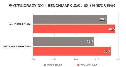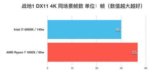 我发现锐龙 amd ryzen 7 1800x似乎对新游戏支持更好,尤其是当我们把游戏画面开高,分辨率调高到2k甚至是4k的时候,处理器对画面的加成效果会尤为显著。比如在战地1 dx11 4k分辨率下,锐龙 amd ryzen 7 1800x能跑55帧,6900k只有45帧。