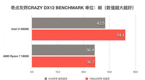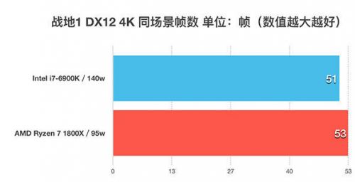 同样的情况也出现在dx12模式当中,53帧微弱领先6900k的51帧。
