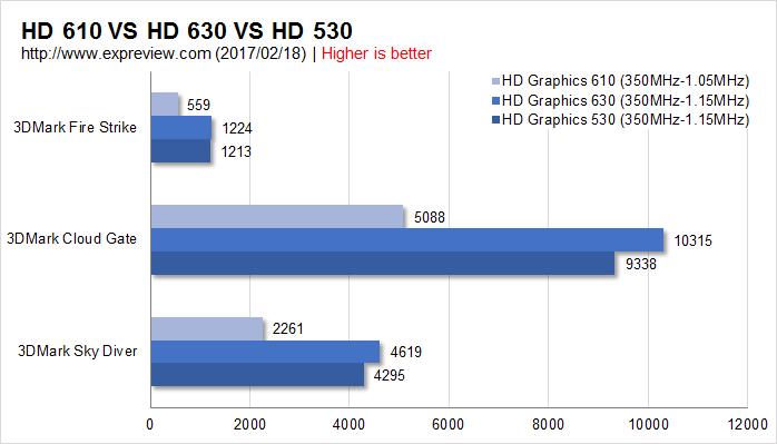 大家一定对只拥有14个eu单元的hd graphics 610集显性能非常感兴趣,在这里我们给出它在3dmark三个测试项目下的成绩,大家可以此为参照,在《kaby lake hd graphics 630核显测试,“挤挤牙膏”战_?_年 》中查找到对应的游戏成绩。