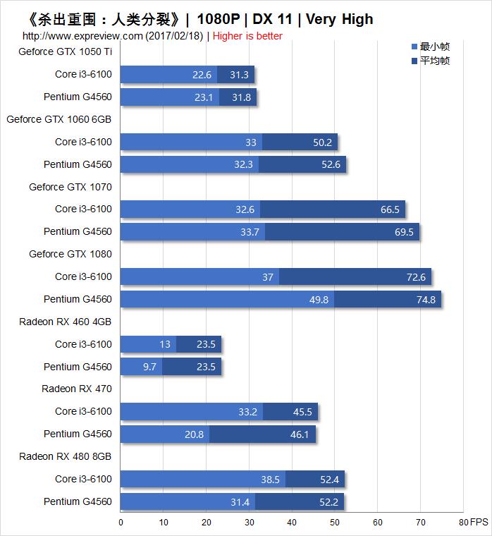 在《杀出重围:人类分裂》中我们明显可以看到奔腾g4560与core i3-6100,无论是nvidia还是amd显卡,高中低级别显卡,其成绩都相当接近,误差均小于3%,可以视为两者成绩相当。仔细读图的你一定能发现一个有趣的事情,nvidia显卡在搭配奔腾g4560处理器时,成绩均好于搭配core i3-6100,而amd显卡搭配奔腾g4560处理器成绩时恰好相反。