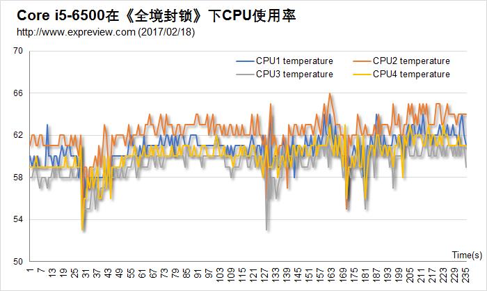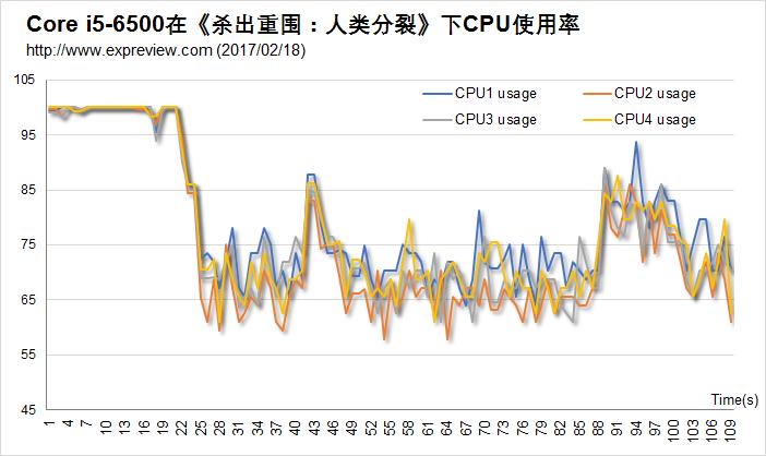 在《杀出重围:人类分裂》中明显看到,游戏对多线程支持度不错,四个线程使用率基本一致,证明都能用得上,并不会出现“一核有难,三核围观”尴尬局面。而奔腾g4560其cpu使用率在80%时间都处于100%满载状态,而酷睿i5-6500在80%时间内负载在65%-75%之间。