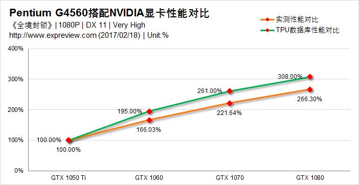 首先我们先来看一看奔腾g4560搭配nvidia显卡情况,《全境封锁》中,从gtx 1060 6gb显卡开始,使用奔腾g4560作为处理器,显卡性能下降约30%,而gtx 1080/1070性能下降40%,因此搭配gtx 1060 3gb级别以下的显卡的话,可以将显卡性能最大利用化,避免显卡性能无用武之地情况。
