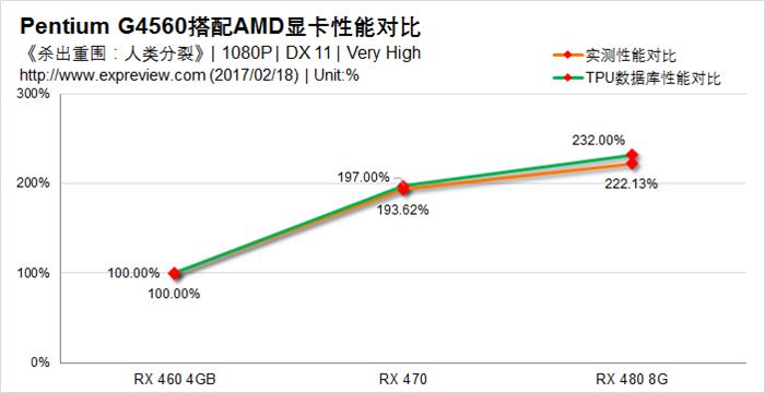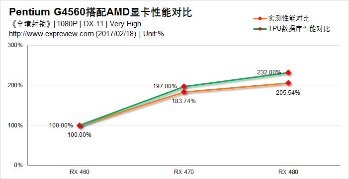 接下来是奔腾g4560搭配amd显卡情况,由于amd在上一年里缺席了高端显卡市场,主要发力于2000元级别以下显卡,因此我们看到奔腾g4560在两个游戏中都能带得起rx 480 8gb显卡,性能损失在10%以内。