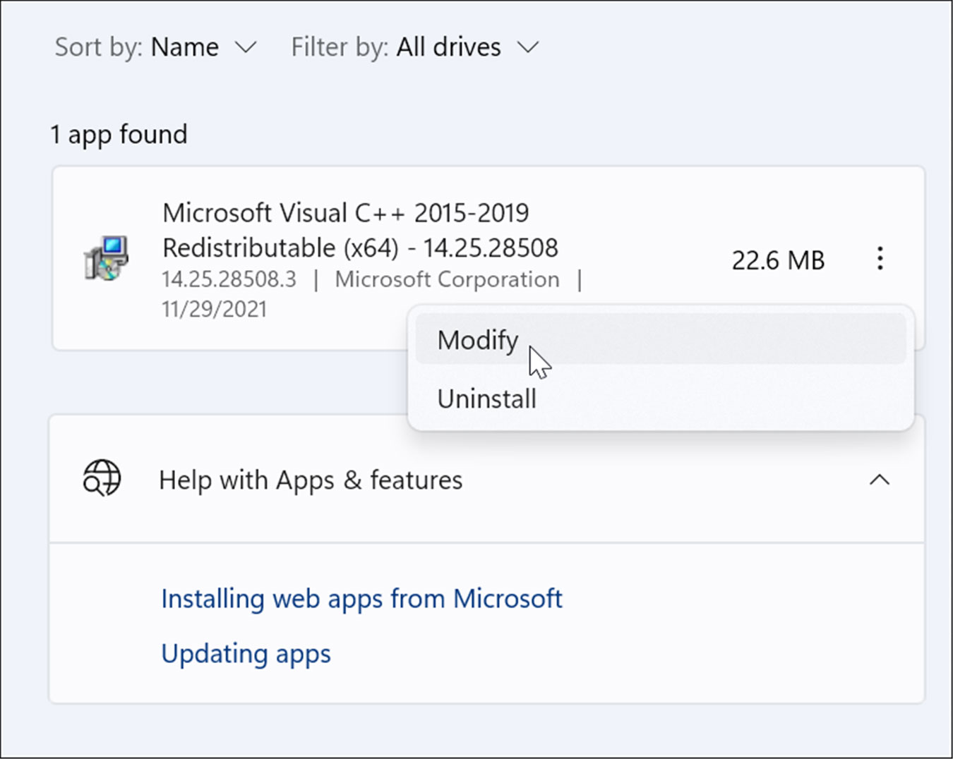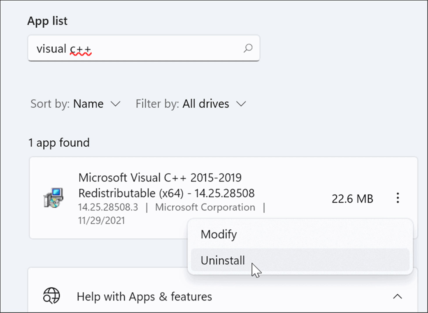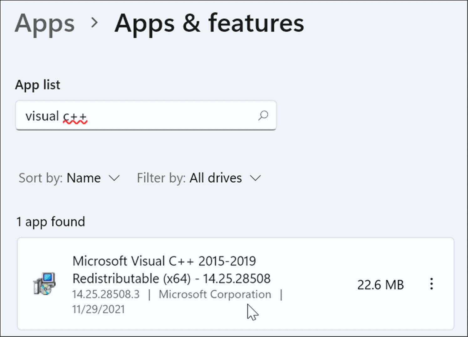 向下滚动apps & features部分并在search 字段中键入visual c++。可能有几个结果,但你想找到microsoft visual c++ 2015-2019 redistributable (x64)。