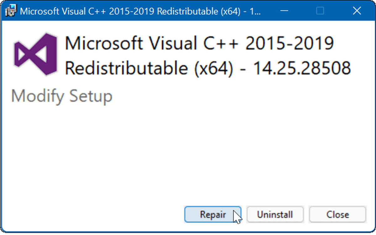 将出现 microsoft visual 屏幕 – 单击修复 按钮。