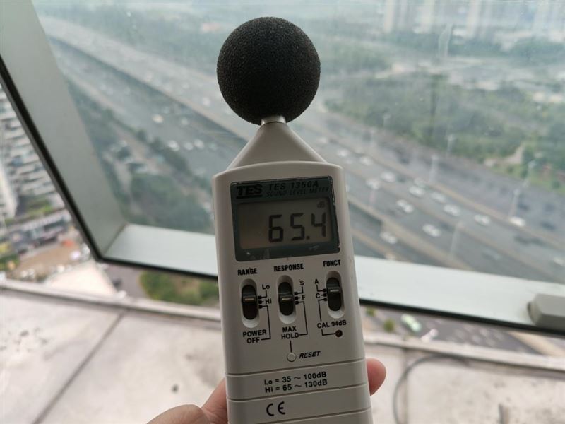 在高处窗口测试,此处的噪音主要是风声和汽车行驶产生的噪音,开启降噪后可以将大多数噪音消除,但是由于刚下过雨,轮胎摩擦地面产生的水声依然存在。