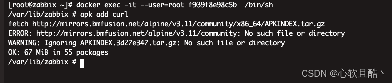 [root@zabbix ~]# docker exec -it --user=root f939f8e98c5b /bin/sh