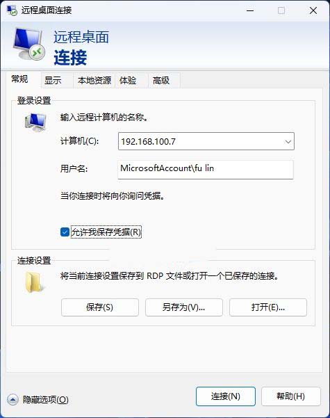 - 允许我保存凭据:在「常规」选项卡中,可以输入用户名并勾选「允许我保存凭据」。保存后,下次连接时,系统会自动填充这些信息,无需重复输入。