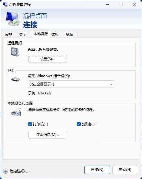 - 本地资源:在连接对话框中点击「本地资源」选项卡,可以设置是否访问本地打印机、共享剪贴板内容,以及如何处理远程音频。