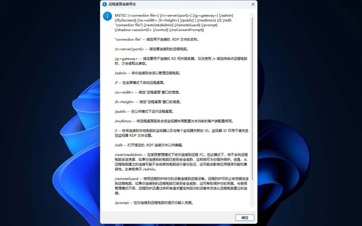 如前所述,如果你不想每次连接都进行参数配置,mstsc命令也支持多种快捷参数: