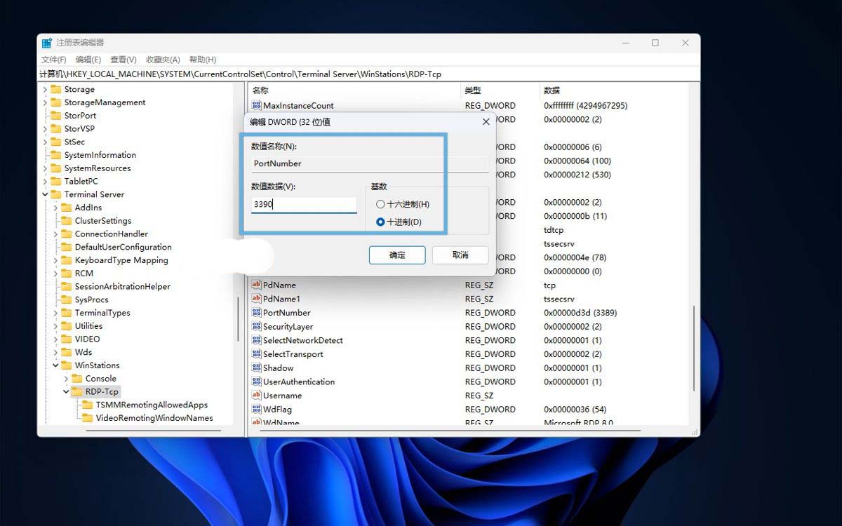 3、双击名为portnumber的 dword (32 位) 值,并将其「十进制」值修改成新的端口,例如3390。