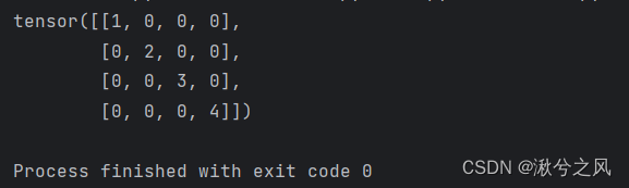 import torch data = torch.tensor([1,2,3,4]) data_two = torch.diag(data,0) print(data_two)