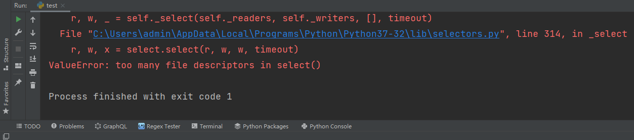windows 平台下,python 版本 3.5,使用异步框架 asyncio,有时候会出现 valueerror: too many file descriptors in select() 的报错信息,我们就来聊一下为什么会出现这种问题,以及问题的一些解决方法。