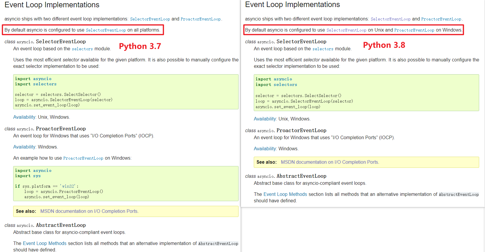 事实上,在 python 3.7 以及之前的版本中, 所有平台默认使用的都是 selectoreventloop,在 python 3.8 以及以后的版本中,unix 平台默认使用的是 selectoreventloop,windows 平台默认使用的是 proactoreventloop,这个差异可以在官方文档中看到。