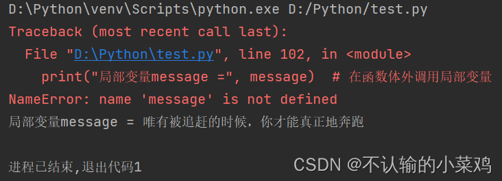 print("局部变量message =", message) # 在函数体外调用局部变量
