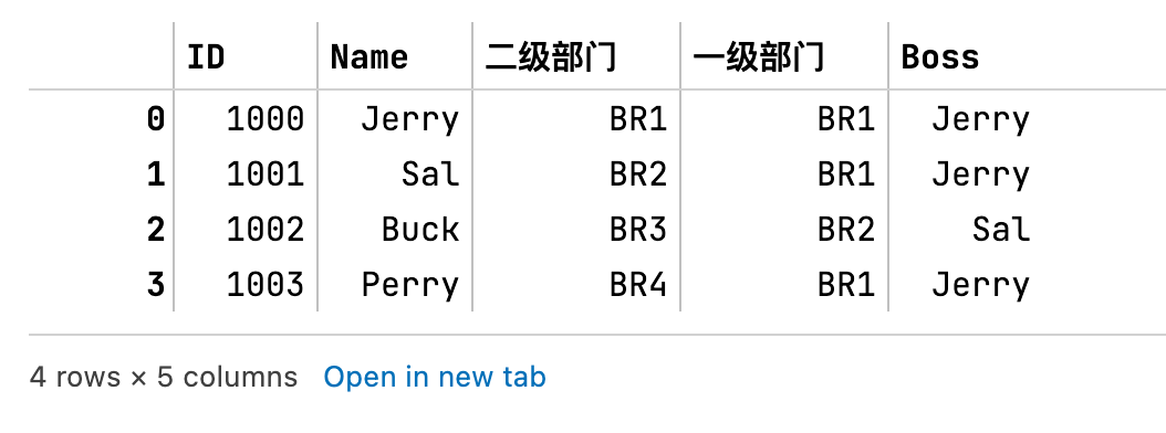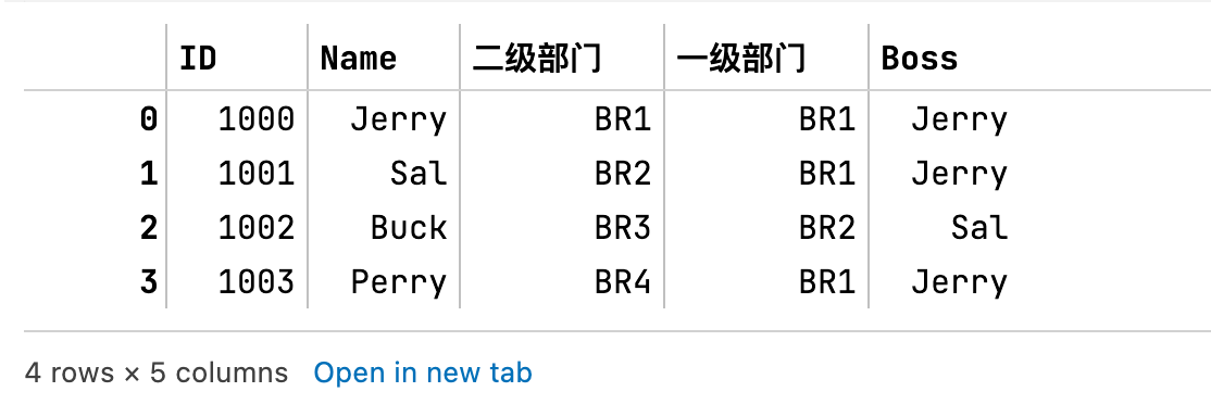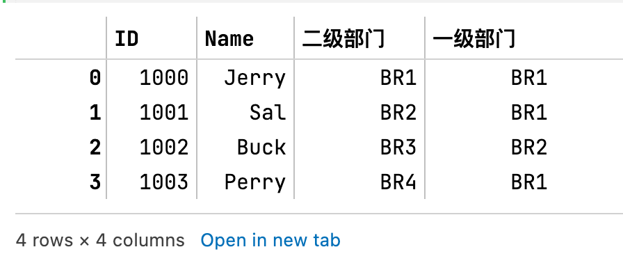 有这样的一个数据,这个数据的第一列是员工的id,第二列是员工的name,第三列是这个员工所属的直接部门,第四列代表这个员工所属的上级部门。