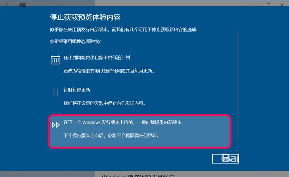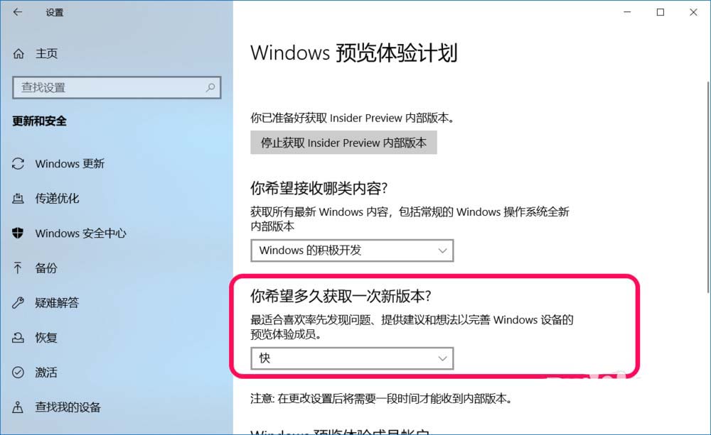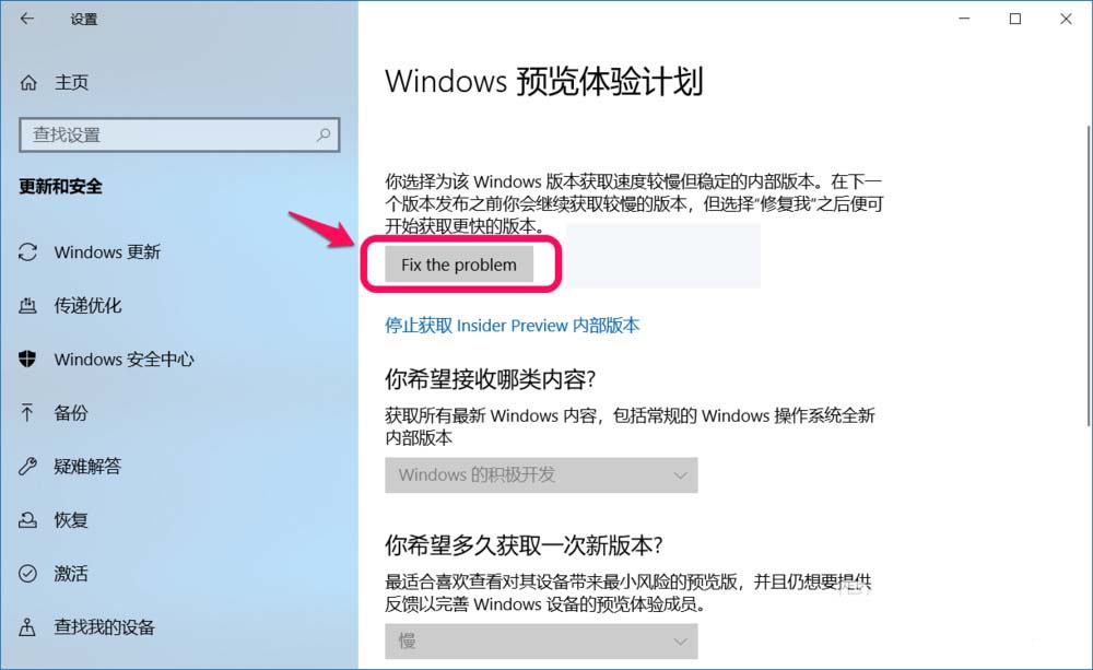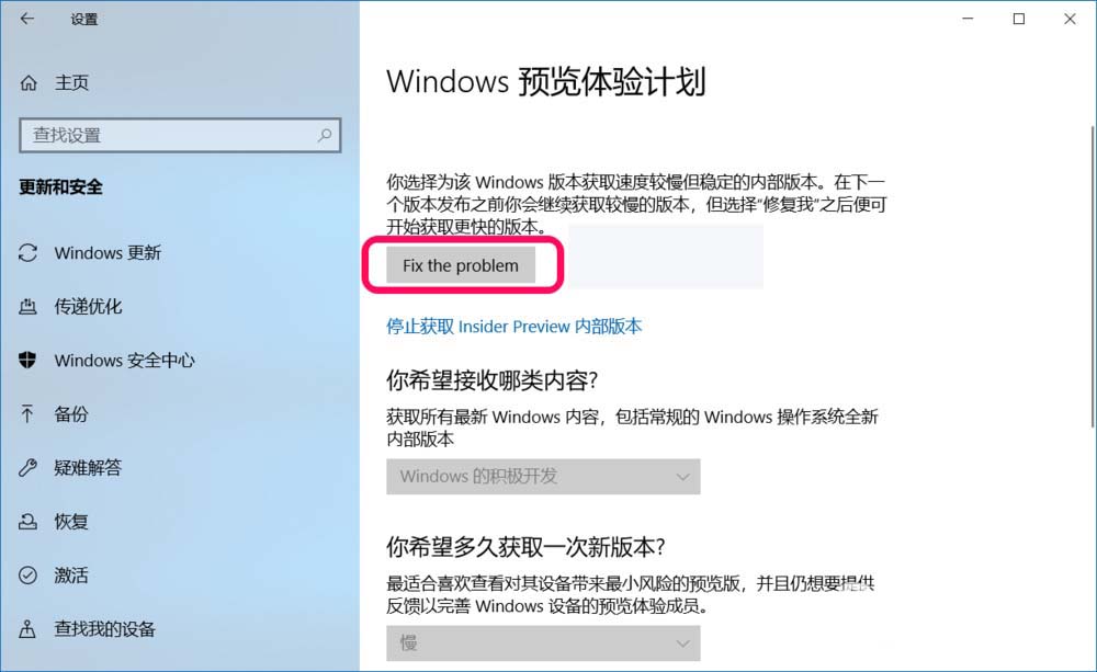你选择为该 windows 版本获取速度较慢但稳定的内部版本。在下一个版本发布之前你会继续获取较慢的版本,但选择【修复我】之后便可开始获取更快的版本。