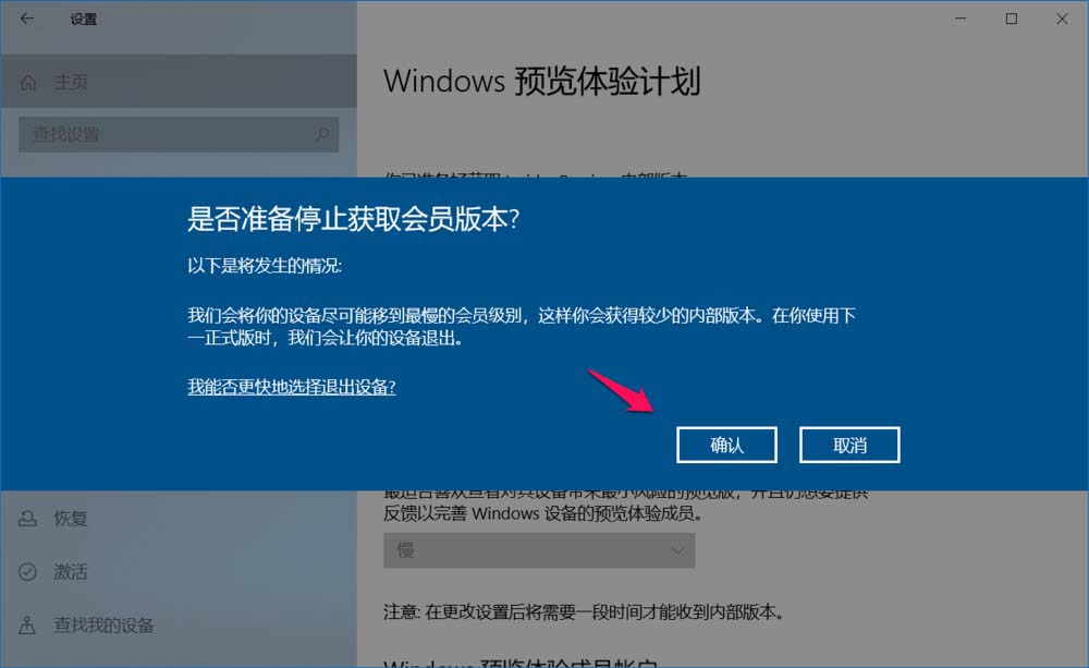 8、我们点击:在下一个 windows 发行版本上市前,一直向我提供内部版本下个发行发行版本上市后,你将不会再获得任何更新。在是否准备停止获取会员版本?对话框中,点击:确定。