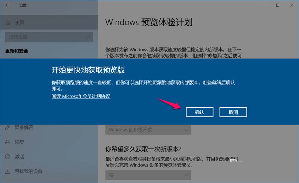2、此时打开一个 开始更快的获取预览版 的对话框,我们点击:确认;