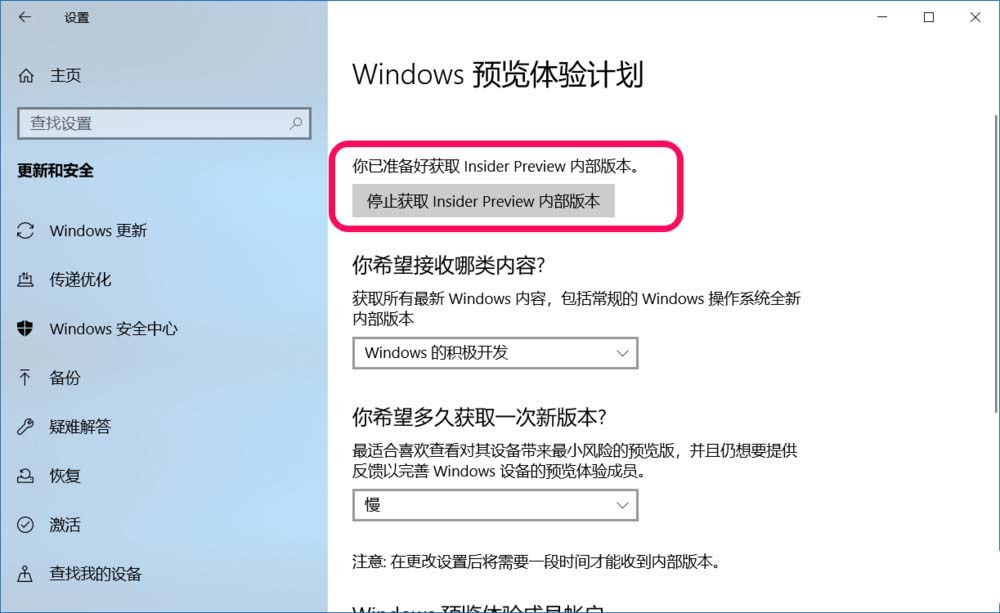 9、我们点击 确定 以后,回到 windows 预览体验计划 窗口中,可以看到: