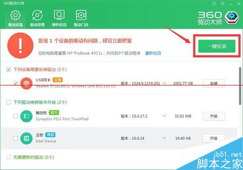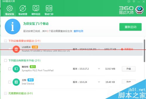 6、打开驱动大师,扫描结果会提示你需要安装usb无线网卡驱动。