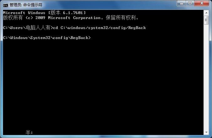 2、输入(按回车键执行命令)进入系统默认备份注册表的文件夹(cd命令为进入):