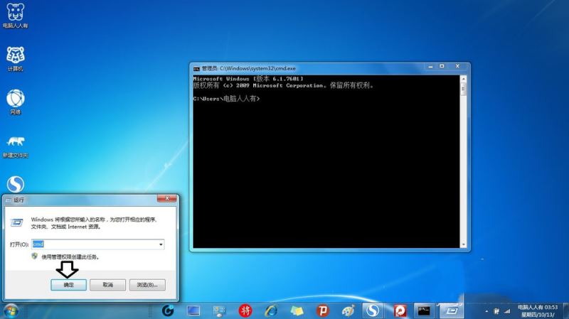 开始→运行→输入:cmd 点击确定(或按回车键),打开命令提示符窗口。