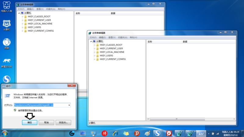 9、64位的操作系统中不仅有64位的注册表regedit.exe程序,还会有专供32位程序使用的regedit.exe程序(路径是:%systemroot%/syswow64),默认两者不能同时打开,但可以使用参数(-m)同时打开,对比之。