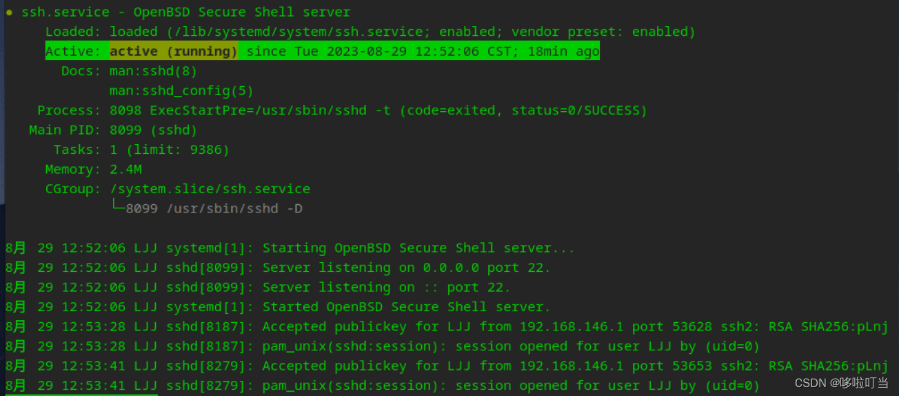 出现active: active (running) since tue 2023-08-29 12:52:06 cst; 18min ago字样表示启用成功,若出现active: inactive (dead)表示ssh服务还未启用