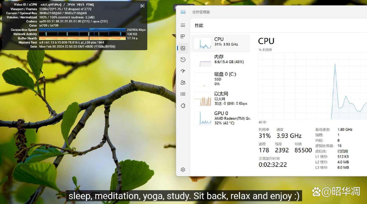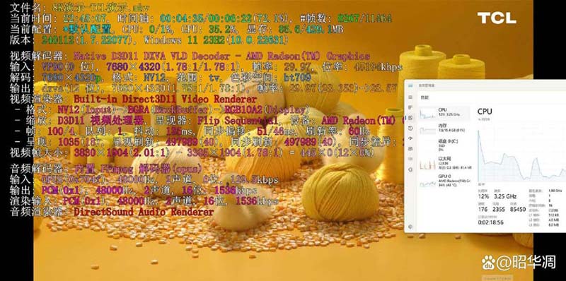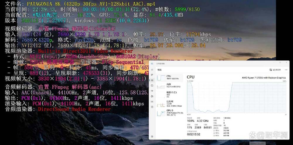 遗憾的是处理器不支持流行的 a v1 编码,8k 级别的演示片虽然播放没问题,但占用资源较多。
