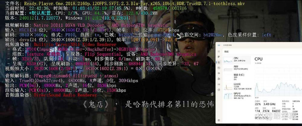 120 帧的影片以丝滑见长,虽然片源不多,但双子杀手、独行侠、阿凡达2 都有 120帧版本,实测 hvc1编码 / hdr / / bt2020 / 4k@120 规格影片可以实现满帧流畅,cpu 占用率在 22%,内存占用 88%左右。