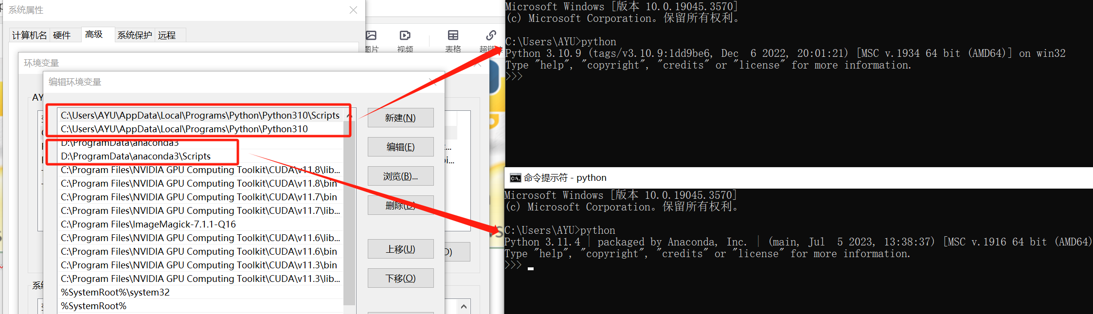 配置环境变量,这里可能出现cmd使用的python版本还是使用anaconda的base环境的情况,这是因为在环境变量path中anaconda的顺序排在原生python的前面,调整原生python的路径在anaconda的base之前即可。